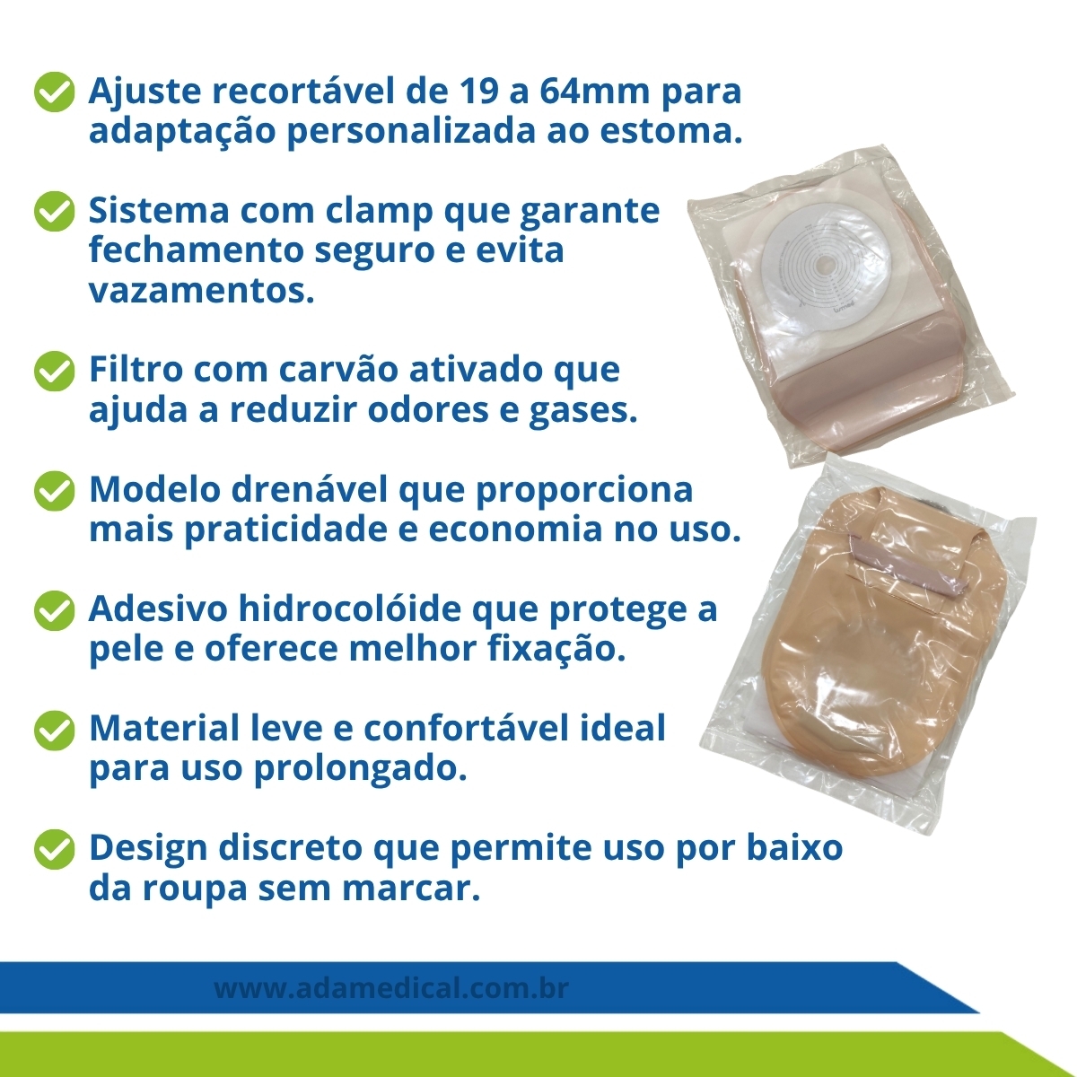 Perfeita para quem busca uma solução confiável, essa bolsa drenável oferece ajuste personalizado (recortável de 19 a 64mm), adaptando-se perfeitamente ao estoma e proporcionando muito mais conforto e proteção.