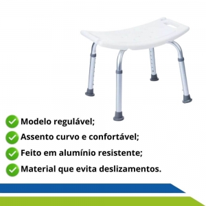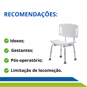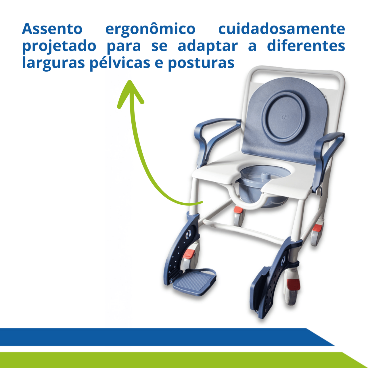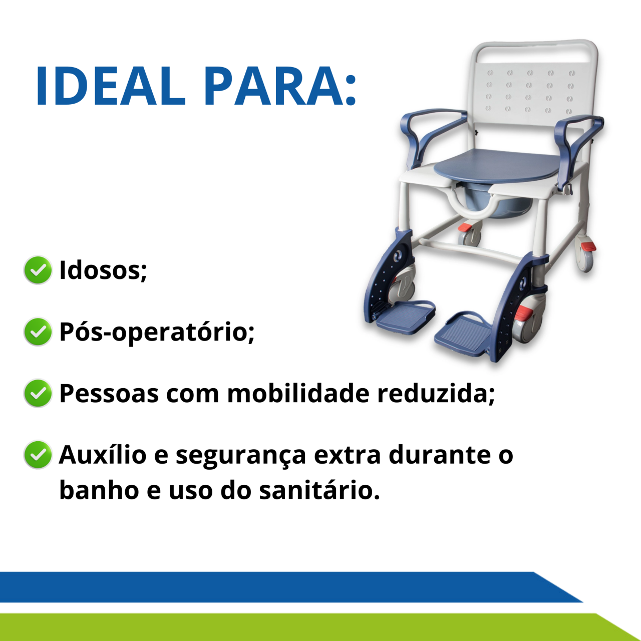 - Banho Seguro: Proporciona um assento estável e confortável durante o banho, com rodas que facilitam a movimentação e freios que garantem a imobilidade quando necessário.